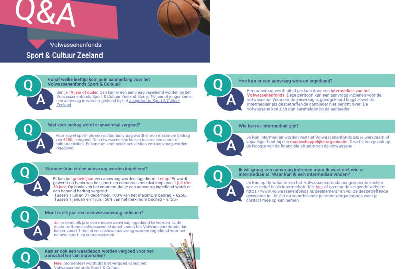 Bent u een sport en/of creatieve aanbieder? Haak aan bij het Volwassenenfonds, zodat de contributie/het lesgeld vergoed kan worden via het fonds. Tevens kan u als vereniging bekendheid geven aan het fonds via de (social) media kanalen. Hoe meer mensen het Volwassenenfonds Sport & Cultuur kennen, hoe meer mensen kunnen sporten, bewegen of ontspannen. Kijk op de website van het Volwassenenfonds voor meer informatie en promotiemateriaal. Download de communicatiematerialen uit de toolkit en laat uw netwerk weten dat mensen bij u aan de slag kunnen met sport of een creatieve activiteit.
